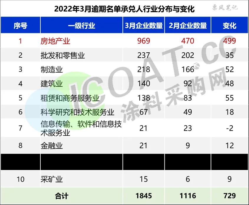 據(jù)上海票交所公布的截至2022年3月31日的商票持續(xù)逾期名單可以看出,名單上企業(yè)合計(jì)1904家,企業(yè)名稱中帶“地產(chǎn)”、“置業(yè)”的企業(yè)就達(dá)到942家,房地產(chǎn)相關(guān)企業(yè)可謂是商票逾期的重災(zāi)區(qū),這還不包括建筑、裝飾、工程等相關(guān)企業(yè)。此外,建筑業(yè)、租賃和商務(wù)服務(wù)業(yè)兩個(gè)房地產(chǎn)相關(guān)行業(yè)商票逾期企業(yè)數(shù)量也保持高增長(zhǎng)。