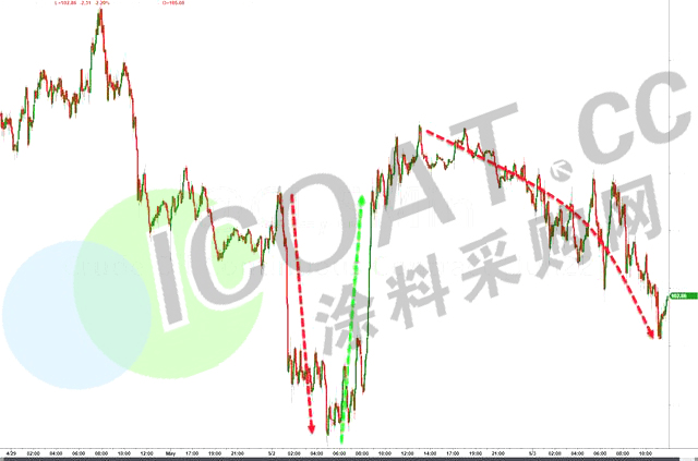 北京時間5月4日凌晨,原油期貨價格收跌。WTI6月原油期貨結(jié)算價收跌2.76美元,跌幅2.62%,報102.41美元/桶。布倫特7月原油期貨結(jié)算價收跌2.61美元,跌幅2.42%,報104.97美元/桶。