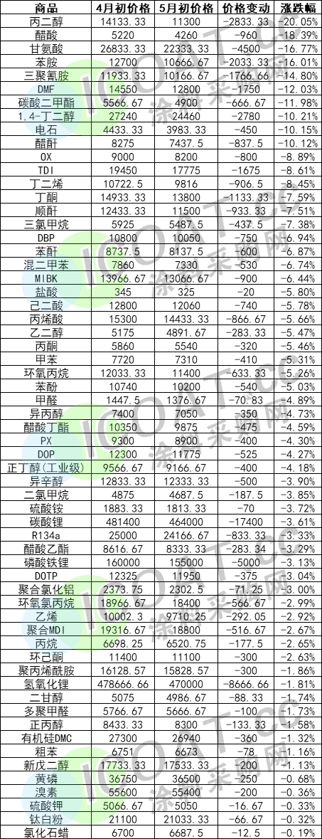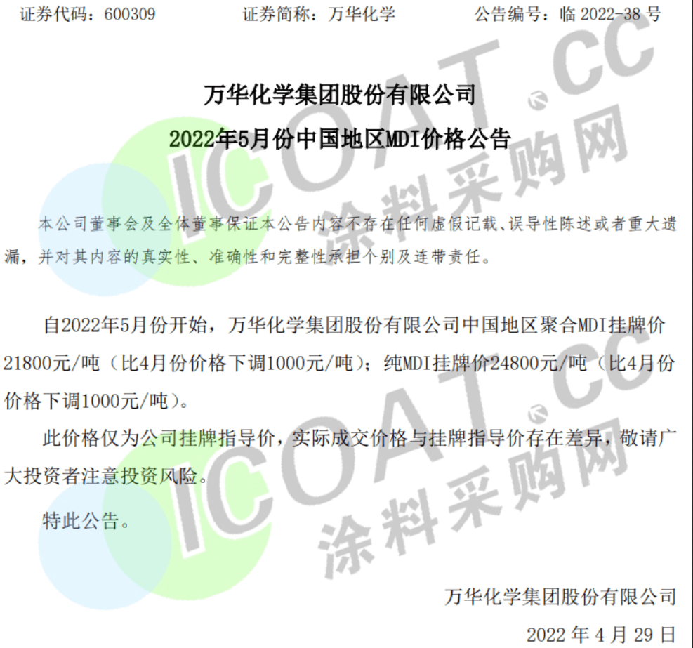 除了化工品產(chǎn)品市場報價下調(diào)外,作為行業(yè)引領(lǐng)者的龍頭企業(yè)也開始陸續(xù)宣布產(chǎn)品價格下跌。萬華化學(xué)公告稱,5月開始,中國地區(qū)聚合MDI掛牌價21800元/噸(比4月份價格下調(diào)1000元/噸),純MDI掛牌價24800元/噸(比4月份價格下調(diào)1000元/噸)。