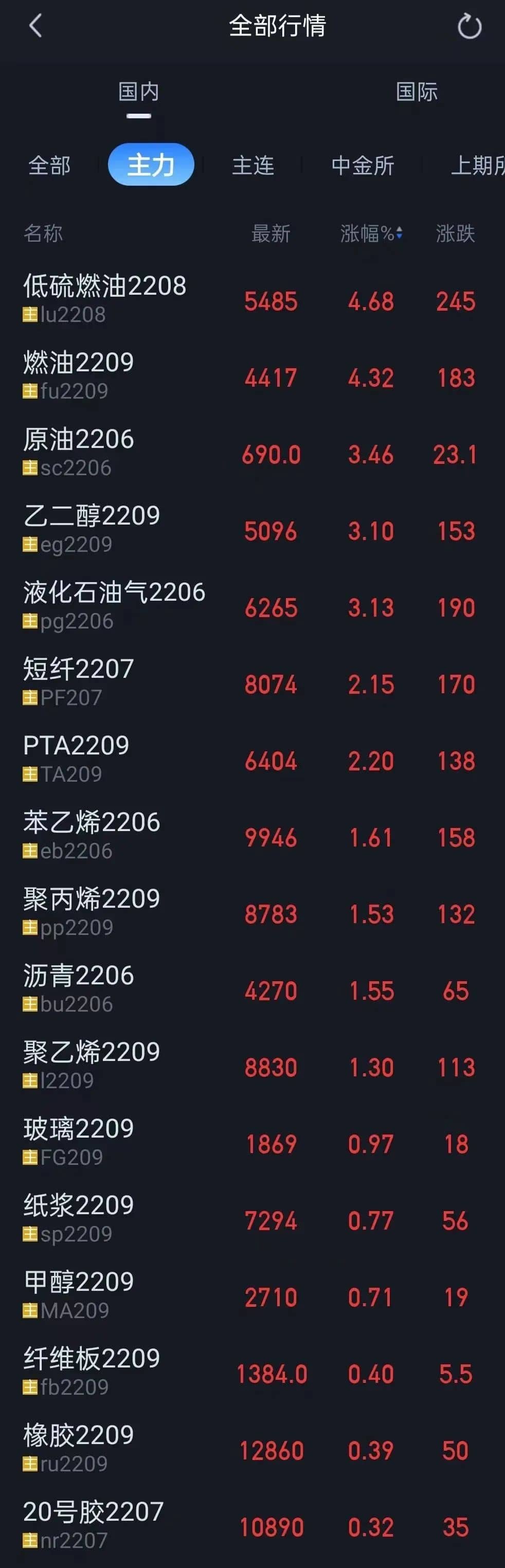 國際原油的上漲無疑也作用在了化工市場上,5日期市開盤,內盤LU燃油、動力煤、燃料油、原油期貨主力開盤漲超4%。短纖、焦炭、20號膠(NR)漲逾2%,液化氣漲超3%。聚乙烯、乙二醇、LPG漲幅均超1%。