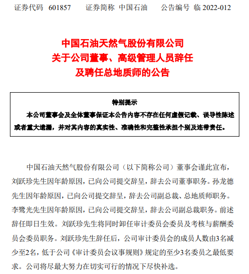 近日,中國石油公告消息:中國石油天然氣股份有限公司公司董事、高級管理人員因年齡原因辭任,詳情如下: