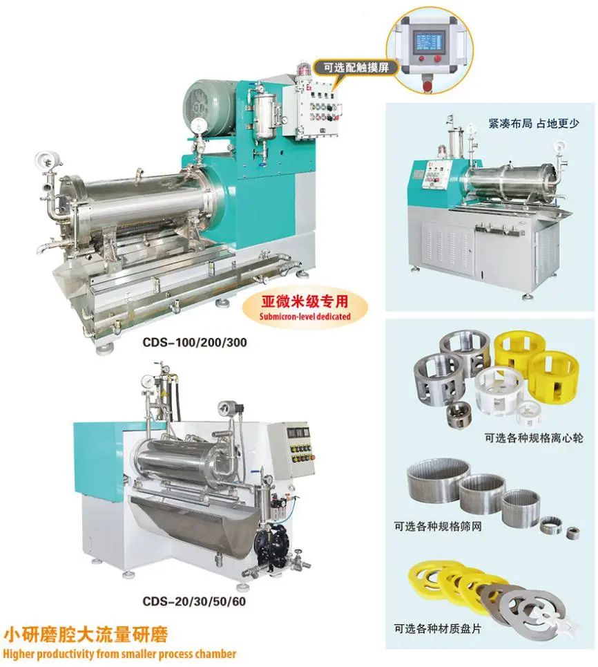 在亞微米級專用領域,不同于傳統(tǒng)砂磨設備低效、難以更換材質(zhì)的體驗,通惠裝備全新打造的CDS大流量砂磨機,采用新研發(fā)功能部件,其中高效率的研磨盤片和超大離心輪及篩網(wǎng),使研磨珠子能更好的分布在研磨腔并安全分離。利用離心動態(tài)分離式篩網(wǎng)提高流量,大大地提高了研磨分散的效率。因其容易更換產(chǎn)品易磨損的備件的特點,可以適合于高磨損的產(chǎn)品。