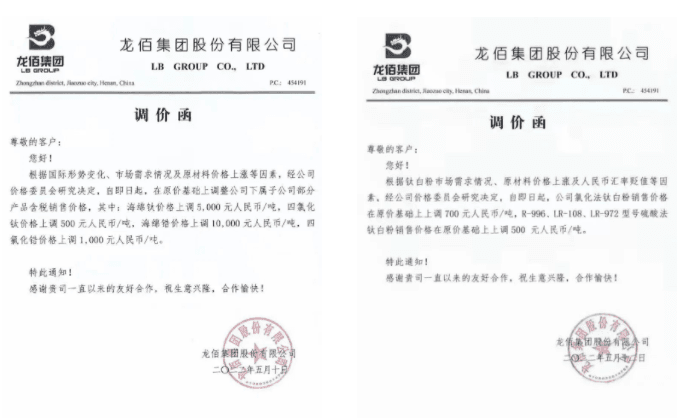 五一假期后返市,鈦白粉主流價(jià)格持穩(wěn)運(yùn)行,部分生產(chǎn)商出現(xiàn)小幅度弱勢(shì),而實(shí)單價(jià)格正是為了穩(wěn)定市場(chǎng),常規(guī)行情波動(dòng)而已,不用賦予其過(guò)多的“使命感”,只是市場(chǎng)的供需情況所致。實(shí)質(zhì)上,現(xiàn)階段更多市場(chǎng)人士和終端用戶更加關(guān)注龍企的價(jià)格走勢(shì),其目前出貨狀態(tài)穩(wěn)定,尤其是出口訂單很好,其海綿鈦、四氯化鈦等部分產(chǎn)品先行宣漲,幅度在500-5000元/噸,緊接著氯化法鈦白粉宣漲700元/噸、硫酸法部分產(chǎn)品獨(dú)立調(diào)漲500元/噸。漲價(jià)函如圖。