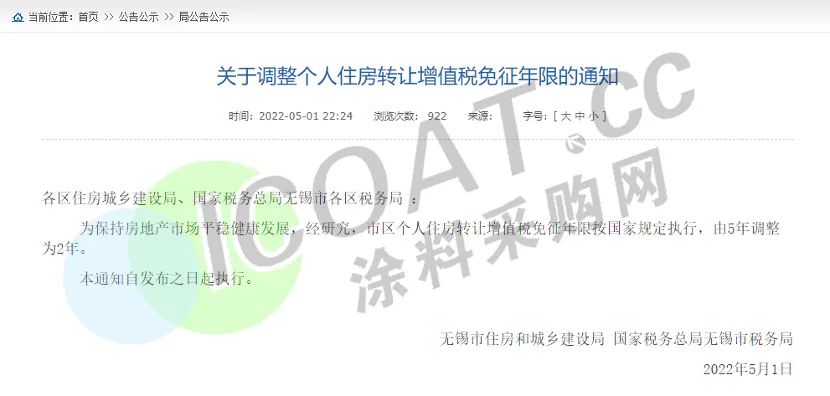 無錫市住房和城鄉建設局、國家稅務總局無錫市稅務局聯合下發《關于調整個人住房轉讓增值稅免征年限的通知》。《通知》明確無錫市區個人住房轉讓增值稅免征年限按國家規定執行,由5年調整為2年。