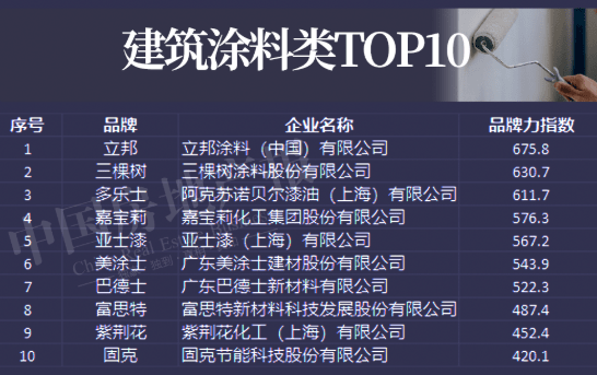 如今,中國建筑涂料產業已經歷經30多年發展,國內本土品牌一直在強勢崛起,以三棵樹、嘉寶莉、亞士、固克、美涂士、巴德士、久諾等為代表的國內本土品牌正在建筑工程涂料領域大放異彩,而且市場份額也遙遙領先。在近期發布的“中國房地產供應商品牌力指數榜”中,立邦、三棵樹、多樂士、嘉寶莉、亞士漆、美涂士、巴德士、富思特、紫荊花、固克等榮耀上榜建筑涂料TOP10。