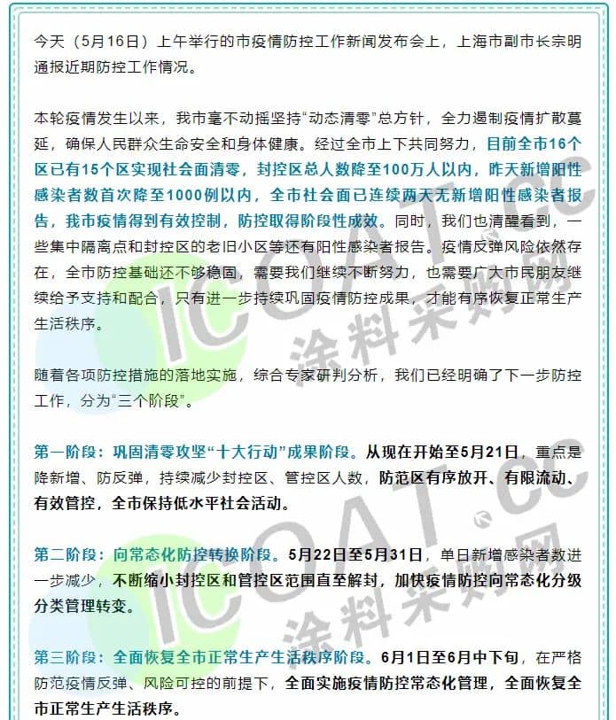 目前,上海已經明確了下一步防控工作,分為“三個階段”。第一階段:鞏固清零攻堅“十大行動”成果階段。第二階段:向常態化防控轉換階段。第三階段:全面恢復全市正常生產生活秩序階段,并明確6月1日至6月中下旬,在嚴格防范疫情反彈、風險可控的前提下,全面實施疫情防控常態化管理,全面恢復全市正常生產生活秩序。