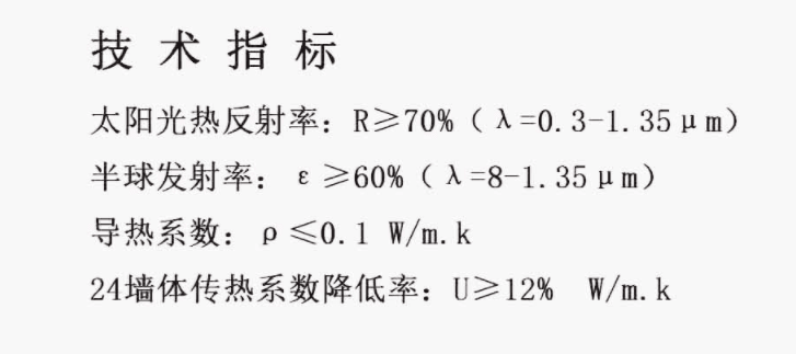 該產(chǎn)品采用國際通用的光學(xué)、熱傳導(dǎo)學(xué)原理和技術(shù)指標(biāo)進(jìn)行產(chǎn)品的功能檢測評定,有效保障產(chǎn)品質(zhì)量的可靠和穩(wěn)定。經(jīng)權(quán)威機(jī)構(gòu)檢測后可知,產(chǎn)品涂層的高太陽熱反射率、低太陽熱吸收率可使墻表面溫度有效降低10-15℃,減少空調(diào)開啟次數(shù),節(jié)省電耗,達(dá)到節(jié)能減排的目的和效果。