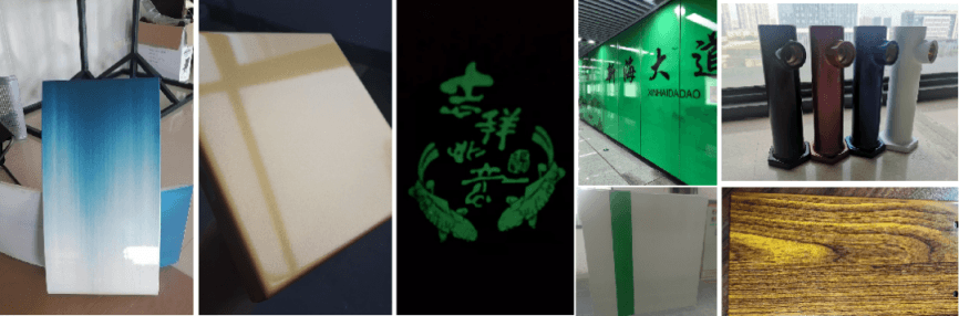 柔性陶瓷水漆的外觀也十分豐富,可以根據(jù)要求制備出各種實(shí)色漆、珠光漆、鋁粉漆,撒點(diǎn)、磨砂、夜光等效果,也可與印刷技術(shù)結(jié)合制備更炫麗的圖案效果。