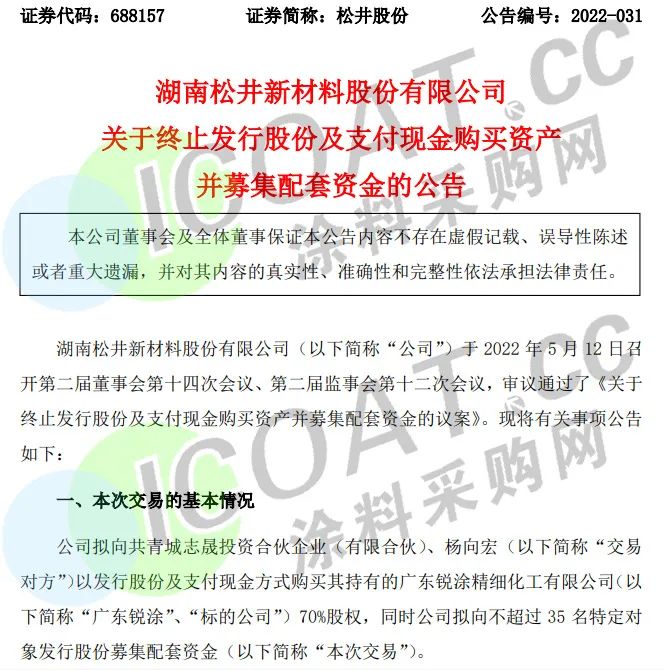 近日,A股涂料上市公司松井股份發布公告稱,公司決定終止向共青城志晟投資合伙企業(有限合伙)、楊向宏以發行股份及支付現金方式購買其持有的廣東銳涂70%股權并募集配套資金事項。