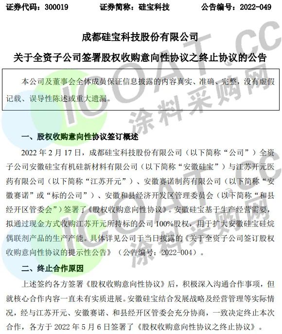 安徽硅寶基于生產經營需要,擬通過現金方式收購江蘇開元所持標的公司100%股權,用于擴大安徽硅寶硅烷偶聯劑產品的生產產能。此后安徽硅寶結合發展戰略及經營管理等實際情況,經與江蘇開元、安徽賽諾、和縣經開區管委會充分協商,一致決定終止本次合作,各方于2022年5月6日簽署了《股權收購意向性協議之終止協議》。