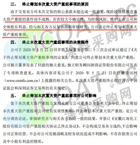 江南化工公告稱,收購浙江新聯民爆器材有限公司宣布終止。由于交易雙方對此次交易的核心條款未能達成一致意見,現階段繼續推進重大資產重組的條件尚不成熟,存在較大不確定性,公司為控制風險,決定終止籌劃本次重大資產重組事項。