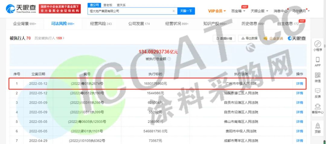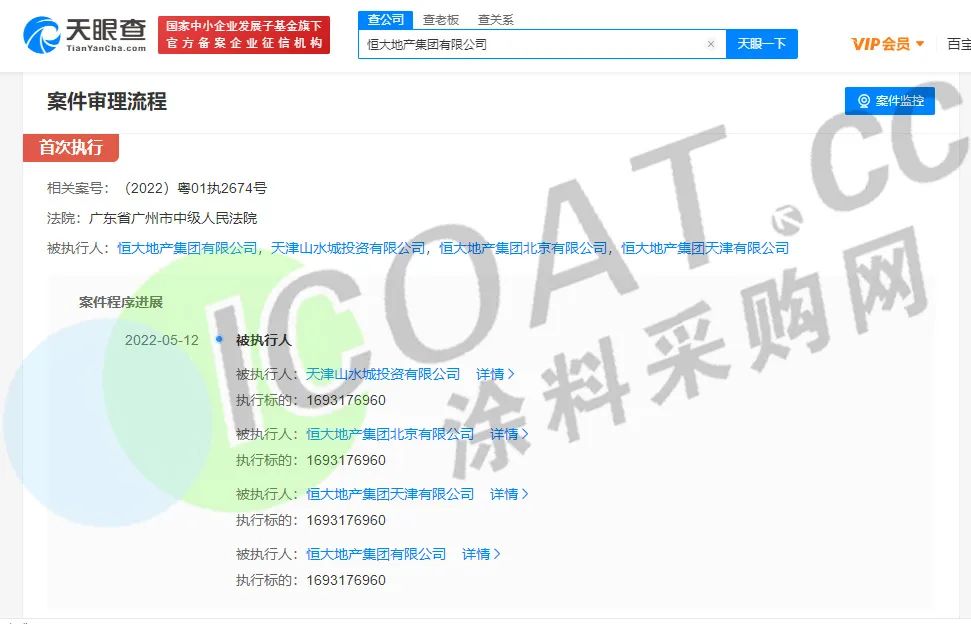 近日,恒大地產集團有限公司新增多則被執行信息,其中最新一則執行標的達16.9億元,執行法院為廣州市中級人民法院,被執行4家企業均為恒大關聯公司。截至目前,恒大地產集團有限公司被執行總標的已超134億元。