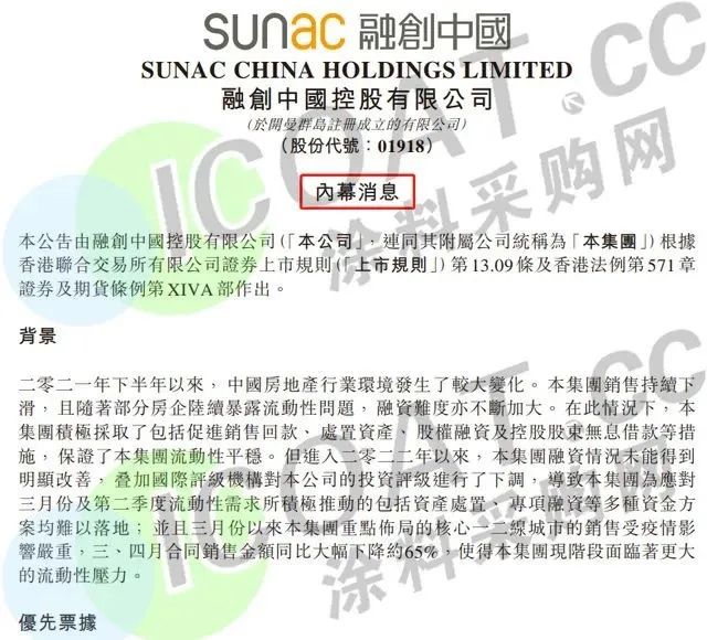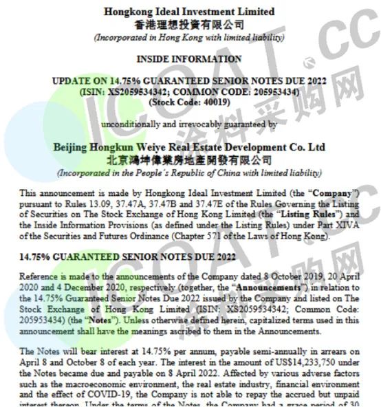 鴻坤地產公告稱,受宏觀經濟環境、房地產行業、金融環境和疫情等各種不利因素影響,其未能償還應計未付利息,發生違約事件。據公開資料,本期票據發行規模2.05億美元,當前余額1.93億美元,票息14.75%,到期日為2022年10月8日,由香港理想投資有限公司發行,鴻坤偉業提供無條件且不可撤銷的擔保。