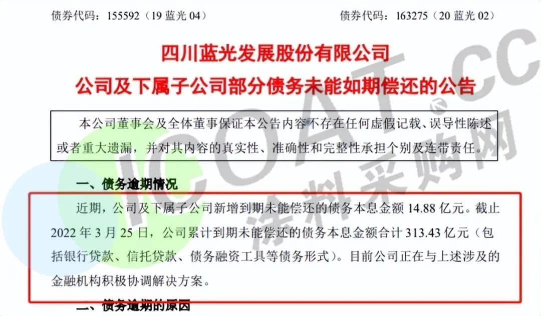 藍光發展發布公告稱,近期,該公司及下屬子公司新增到期未能償還的債務本息金額14.88億元,目前藍光發展累計到期未能償還的債務本息金額合計313.43億元(包括銀行貸款、信托貸款、債務融資工具等債務形式)。