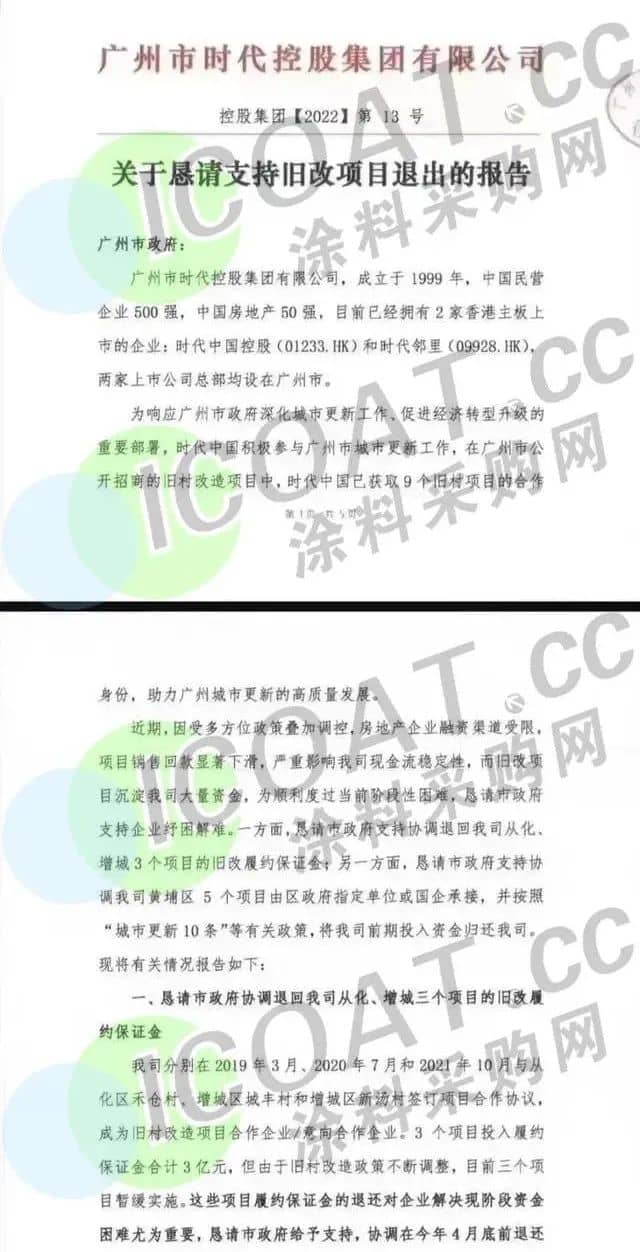 具體來看,時代控股集團懇請廣州市政府支持協調退回從化、增城3個項目的舊改履約保證金;支持協調黃埔區5個項目由區政府指定單位或國企承接,并按照“城市更新10條”等有關政策,將前期投入資金歸還。