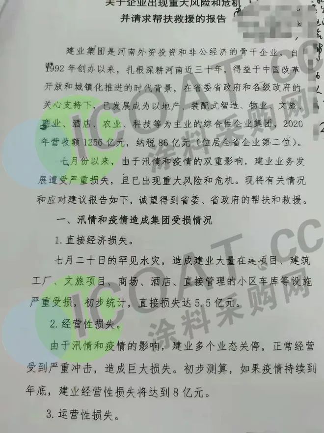 建業集團向河南省政府發出的求救信《關于企業出現重大風險和危機并請求幫扶救援的報告》也在網上廣泛流傳。建業集團已出現重大風險和危機,目前已經進入戰時緊急狀態,正在制定應對預案,與此同時,建業集團吁請河南省委、省政府采取以下4項非常措施,幫助建業渡過難關: