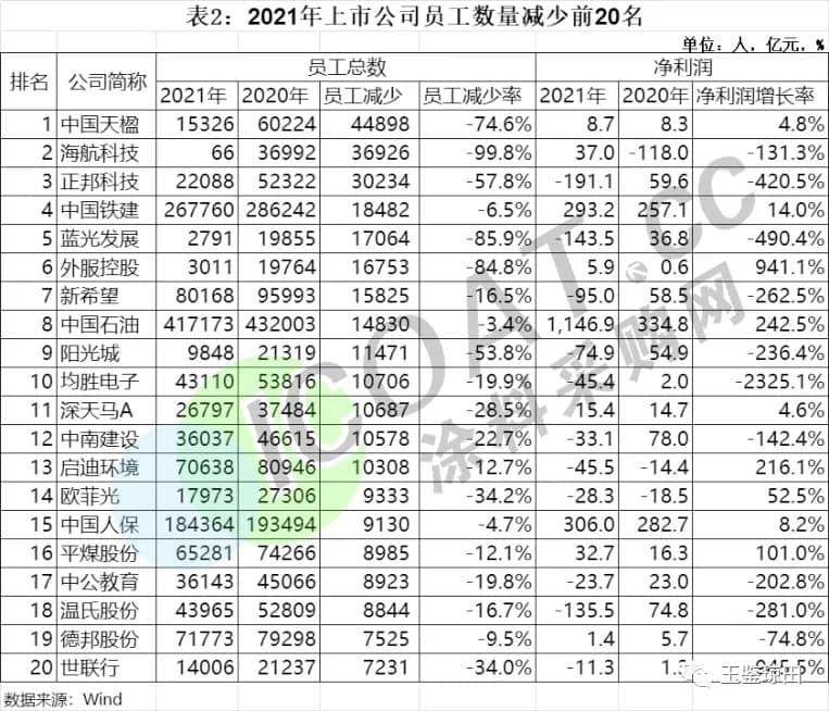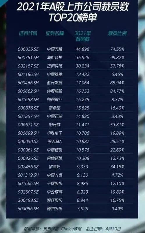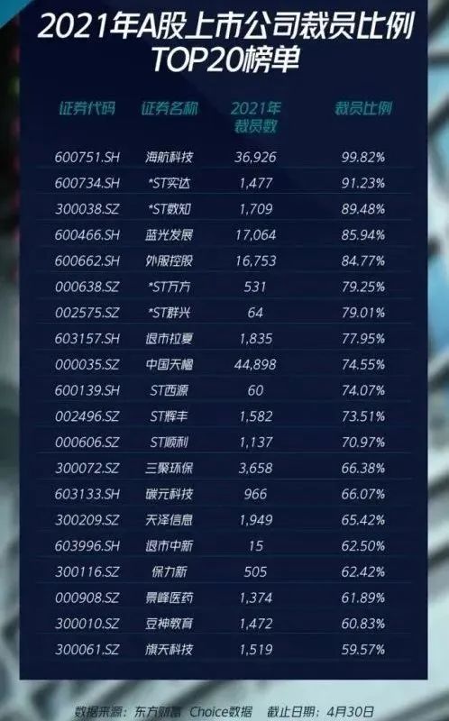 除了風口浪尖上的互聯(lián)網(wǎng)大廠外,在跌宕起伏的股市變幻中,不少上市公司也受到波及,業(yè)績大幅下滑,并采取了結(jié)構(gòu)優(yōu)化調(diào)整的方式保存實力。截至4月30日,A股共有4650家企業(yè)公布了員工變動人數(shù),其中有1697家企業(yè)進行了不同程度的裁員,裁員總數(shù)為909993人。在這1700家中,裁員人數(shù)上萬的有14家企業(yè),2021年共有新希望等14家上市公司員工數(shù)量減少超1萬人以上。