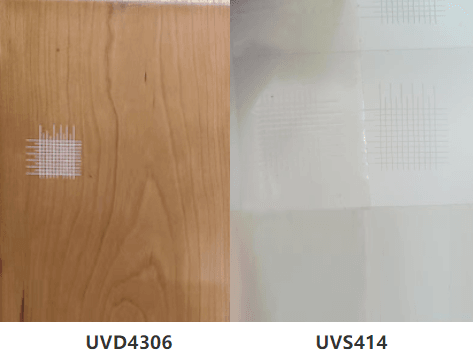 UVD4306和UVS414的附著力都是0級,適用于全UV、UV底PU面、UV底水性面等工藝,附著力均優良,建議采用PU底/UV底水性面工藝都要先通過安全測試評估后,才能進行落地施工。