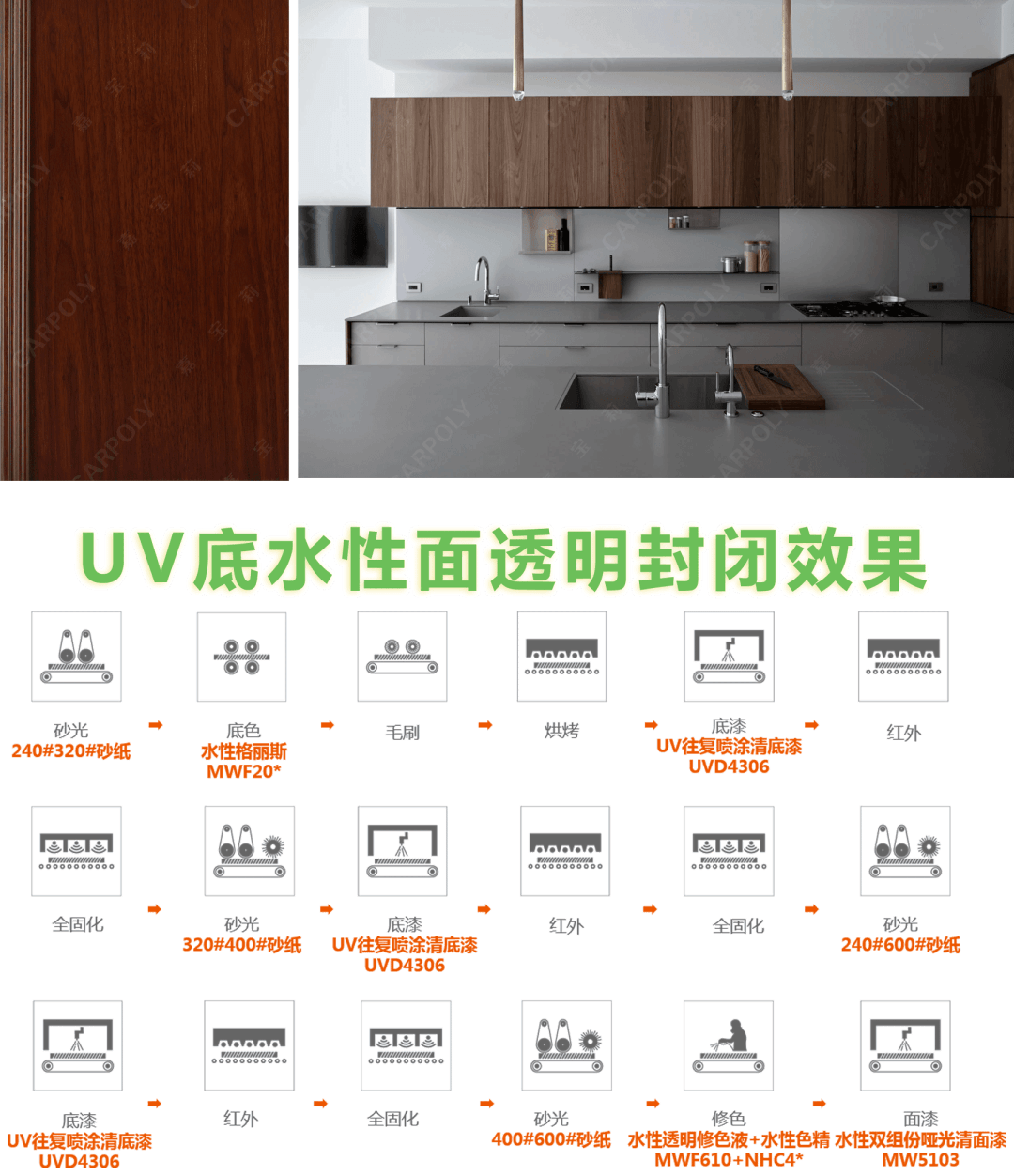 UV往復噴涂清底漆UVD4306在透明度、打磨性、流平性等核心性能都有優良的表現,綜合性能好,漆膜清透豐滿,能很好展現基材紋理之美。