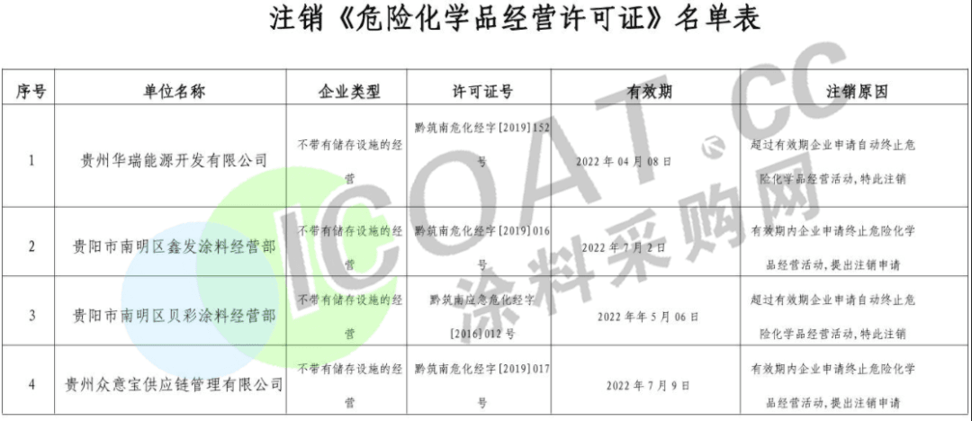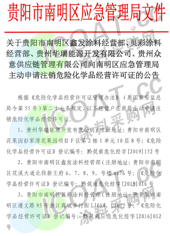近日,貴州省貴陽市南明區(qū)應(yīng)急管理局發(fā)布文件,公布貴陽市南明區(qū)鑫發(fā)涂料經(jīng)營部、貝彩涂料經(jīng)營部等4家企業(yè)主動(dòng)申請注銷危險(xiǎn)化學(xué)品經(jīng)營許可證。