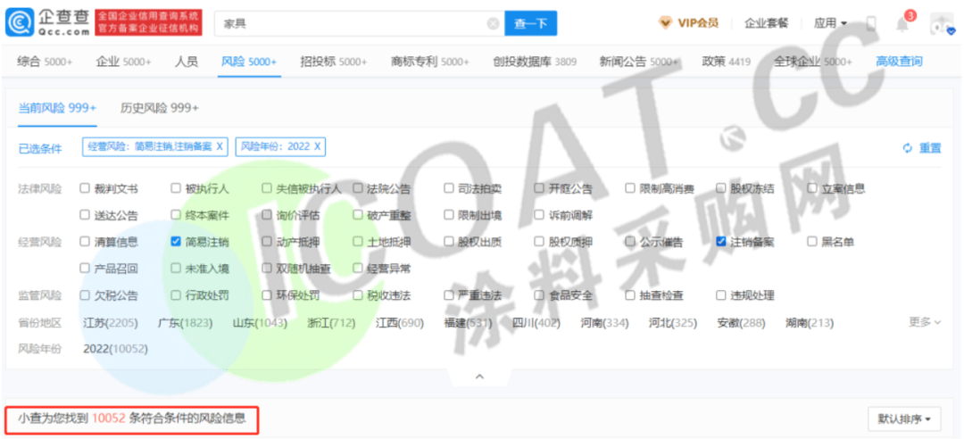 家具行業(yè),2022年以來,正在簡易注銷、注銷備案或是破產(chǎn)重整狀態(tài)的企業(yè)為10052家。