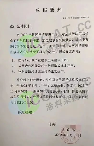 近日,廣東東莞某企業(yè)發(fā)布放假通知,稱國內(nèi)外訂單嚴(yán)重脫節(jié)呈斷崖式下跌,成品貨物不能及時出貨而造成成本積壓,物料斷斷續(xù)續(xù)無法維持正常生產(chǎn),決定于2022年6月1號開始無薪放假,暫定至2022年10月中旬復(fù)工。