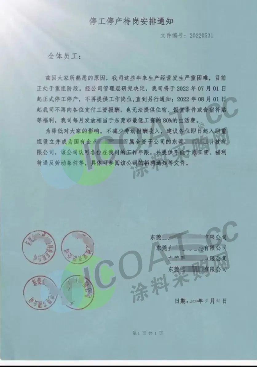 無獨有偶,東莞另外一家大廠的員工突然收到企業(yè)發(fā)的《停工停產(chǎn)待崗安排通知》,稱企業(yè)生產(chǎn)經(jīng)營發(fā)生嚴(yán)重困難,目前正處于重組階段,將于2022年7月1日起正式停工停產(chǎn),不再提供工作崗位,直到另行通知;8月1日起不再向員工支付工資報酬,也無法提供住宿、飯?zhí)脳l件或食宿補貼等福利,企業(yè)每月發(fā)放相當(dāng)于東莞市最低工資的80%的生活費。