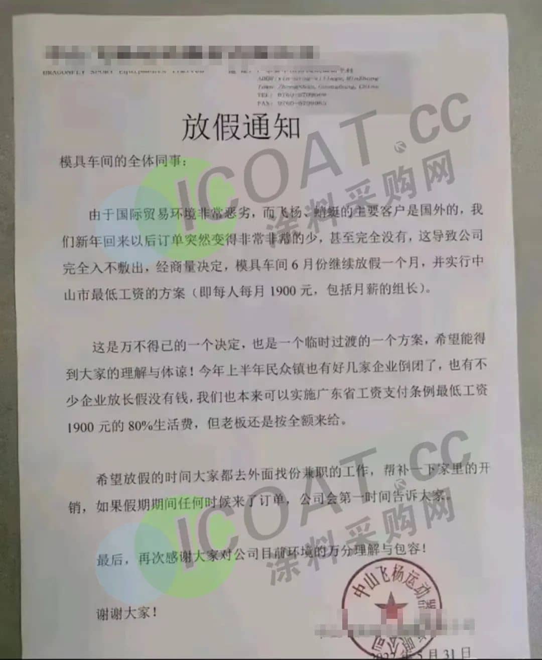 廣東中山某企業(yè)表示,新年回來以后訂單非常少,甚至完全沒有,導(dǎo)致企業(yè)入不敷出,模具車間6月繼續(xù)放假1個月,并實行中山市最低工地的方案(即每人每月1900元,包括月薪的組長)。