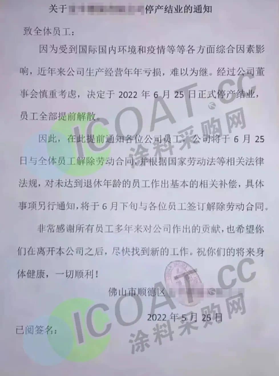 佛山順德某企業(yè)發(fā)布《關(guān)于停產(chǎn)結(jié)業(yè)的通知》,決定于2022年6月25日正式停產(chǎn)結(jié)業(yè),于6月25日與全體員工解除合同。