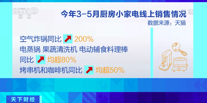疫情期間,人們出行減少,因此“宅經濟”開始火爆發展,間接帶火了各種各樣的小家電。 今年3-5月,空氣炸鍋同比增長200%,電蒸鍋、果蔬清洗機、電動輔食料理棒同比增長均超過了80%,烤串機和咖啡機同比增長均超過50%。