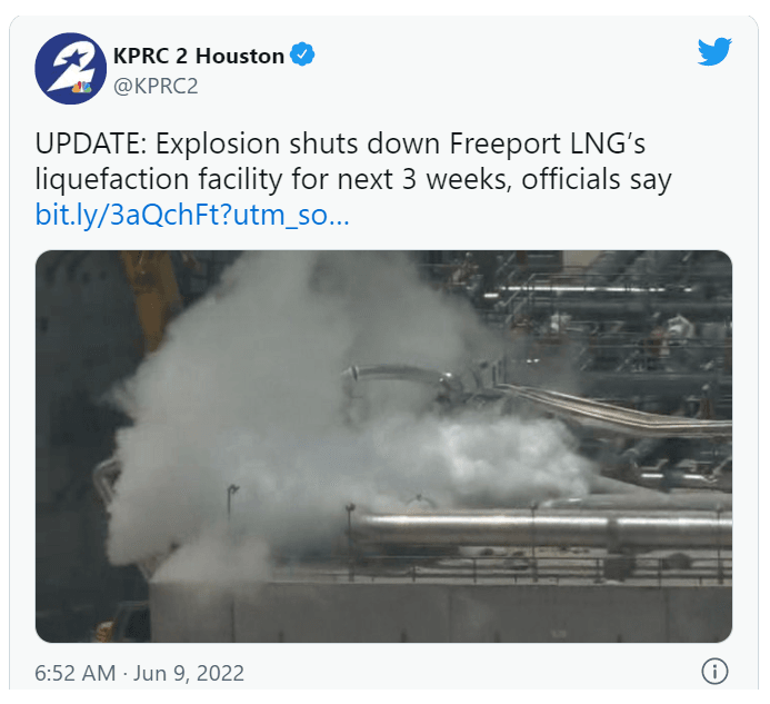 除了石油外,天然氣方面近期也遭遇了重挫,近日,美國最大液化天然氣(LNG)出口終端之一發(fā)生爆炸。這座位于得克薩斯州的LNG設(shè)施將關(guān)閉至少三周,會(huì)損失大約94萬噸LNG出口,其間美國將失去大約五分之一的液化產(chǎn)能。