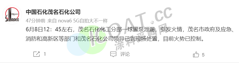 茂名石化化工分部一球罐泵泄漏,導(dǎo)致乙烯裂解裝置芳烴單元中間罐著火。此次故障涉及2#裂解裝置,目前25萬噸/年2#LDPE裝置已停車,開車時(shí)間待定。