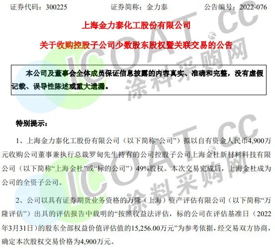 6月9日,金力泰披露,擬以自有資金4900萬元收購公司董事兼執(zhí)行總裁羅甸持有的公司控股子公司上海金杜49%股權(quán)。本次交易完成后,上海金杜成為金力泰的全資子公司。