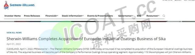 4月1日,宣偉宣布已完成對西卡歐洲工業(yè)涂料業(yè)務(wù)的收購,收購的業(yè)務(wù)將成為公司高性能涂料集團(tuán)運(yùn)營部門的一部分。