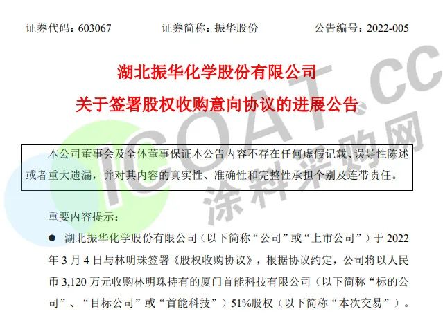 3月7日,湖北振華化學(xué)股份有限公司公告稱,公司與林明珠簽署《股權(quán)收購協(xié)議》,將以3120萬元收購林明珠持有的首能科技51%股權(quán)。