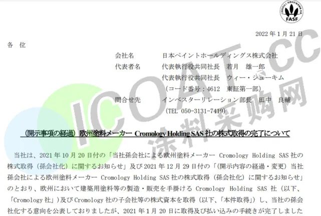 1月18日,科思創(chuàng)表示,通過約4至6百萬歐元(約合人民幣4300萬元)范圍內(nèi)的收購價格,成功購買了JSR株式會社在合資公司日本精細(xì)涂料有限公司剩余30%的股份,從而使其成為科思創(chuàng)的全資子公司。