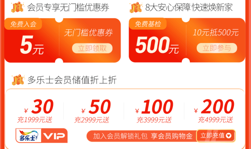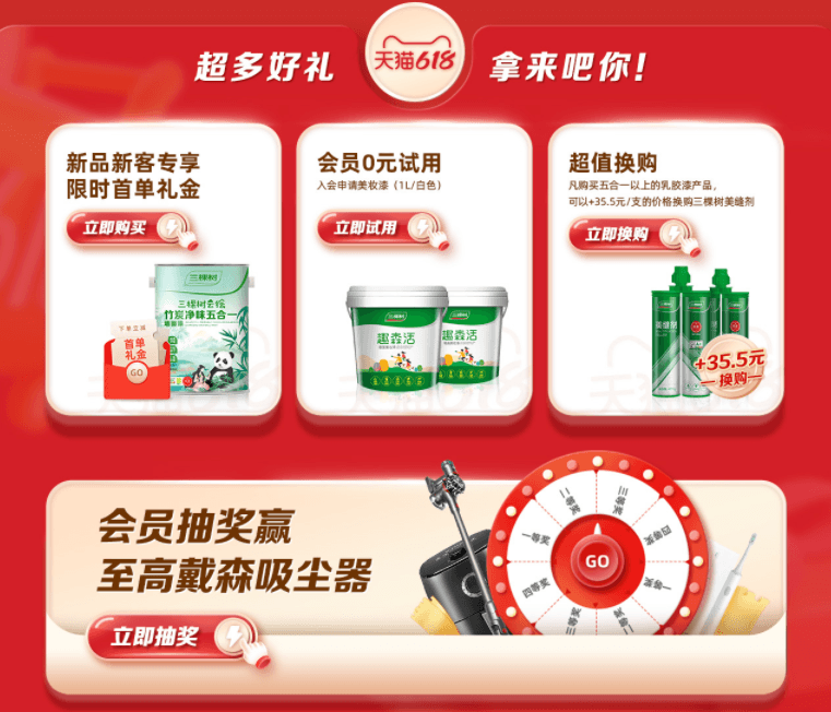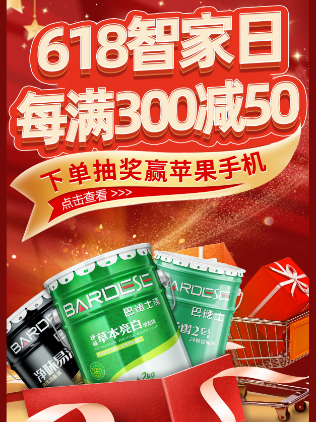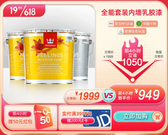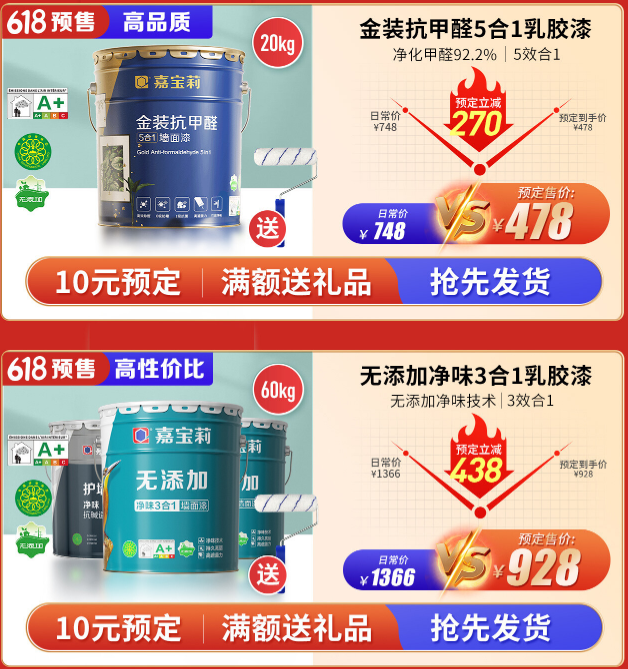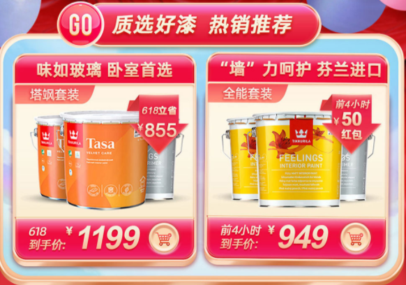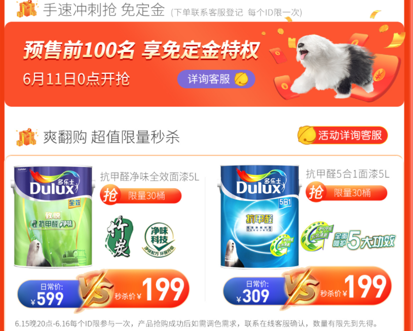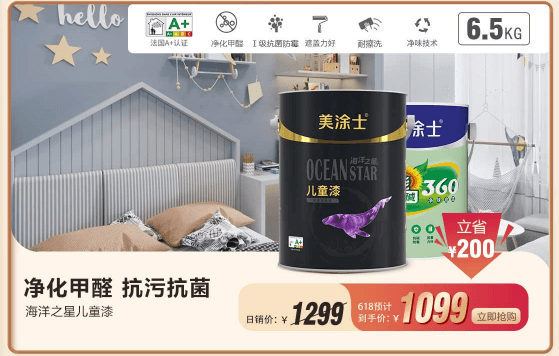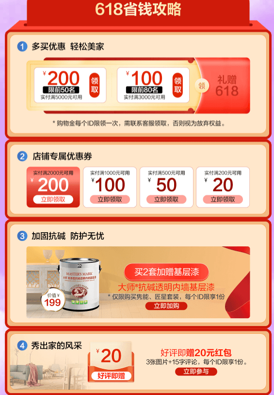 推出“618省錢攻略”,實付滿5000元可用200元優惠券(限前50名),實付滿3000元可用100元優惠券(限前80名)。推出店鋪專屬優惠券,最高可優惠200元。部分產品加贈基層漆,此外部分產品直降970元。