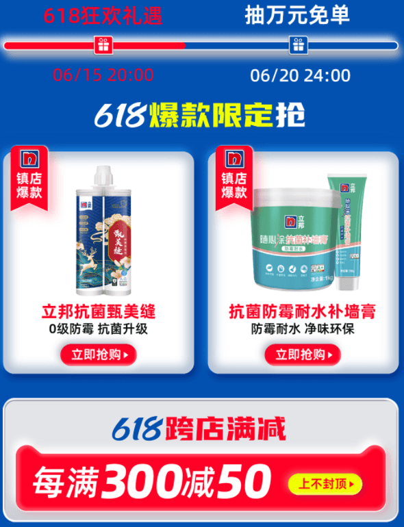 立邦涂料參與了淘寶618跨店滿減活動,每滿300元減50元(上不封頂),并推出了“618狂歡日福利”,到店滿額贏萬元免單,滿額送裝修紅包,會員5折秒殺,以及玩轉盤贏499禮盒等活動。除此之外,還實打實的對部分商品進行了立減50-150元的優惠,