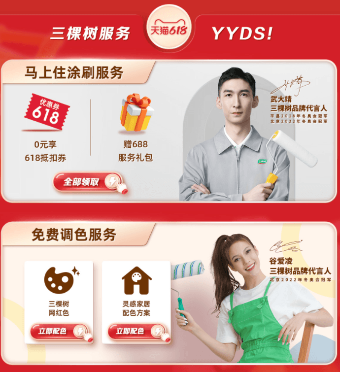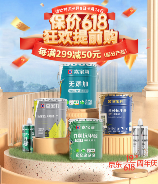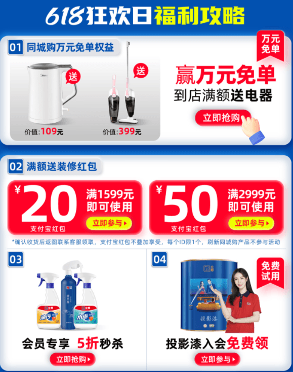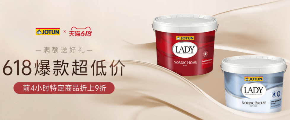 推出618優惠指南,可領會員30元無門檻優惠券,平臺199-20跨店優惠券,399-40跨店優惠券,及799-80跨店優惠券,滿3999元領200元E卡(限量)。可免費選色、免費試色、免費調色,部分產品立省1050元。