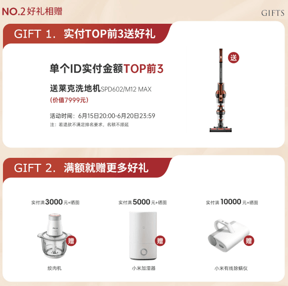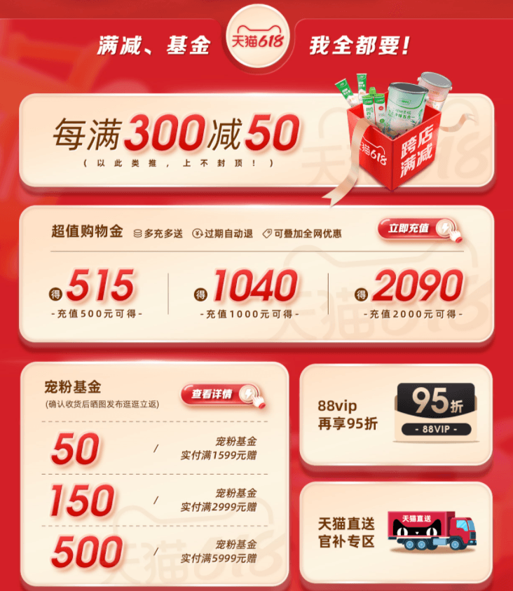 參與了天貓618活動,推出每滿300減50優惠(上不封頂),充值2000元可得2090元超值購物金,實付滿5999元贈500元寵粉基金,88VIP再享95折,以及會員0元使用,超值換購,新客專享首單禮金,會員抽獎等。