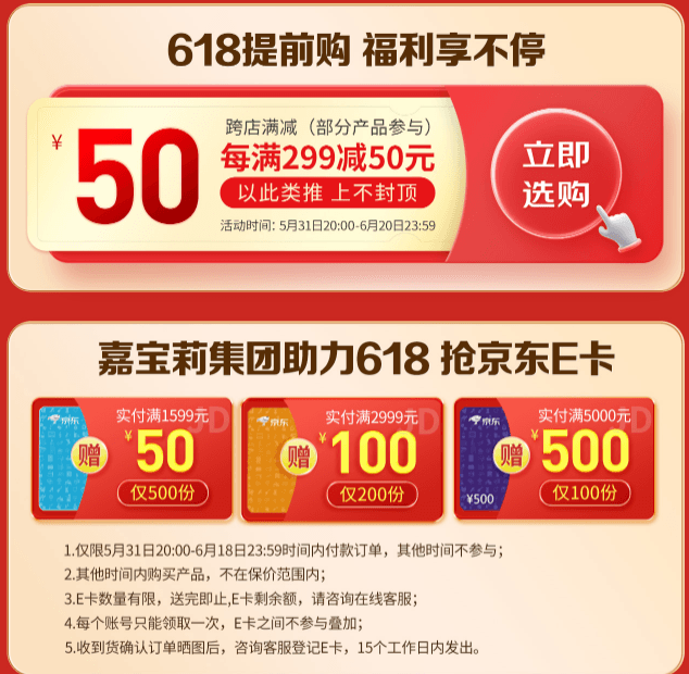 參加京東“保價618狂歡提前購”活動,部分產品每滿299元減50元,部分產品參與跨店滿減,每滿299元減50元(上不封頂),部分產品預定立減最高超過400元。