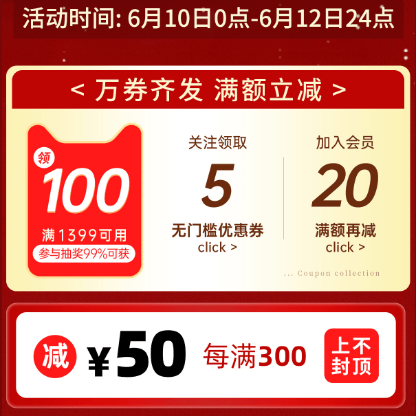 參加天貓618活動,開展“618智家日每滿300減50”活動,下單抽獎贏蘋果手機。萬券齊發,滿額立減,部分產品降價限時搶購。