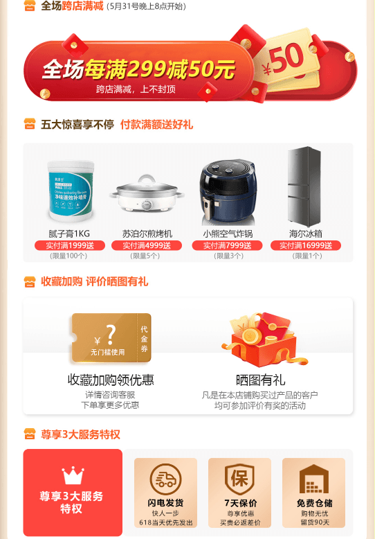 全場跨店滿減,每滿299元減50元(上不封頂),付款滿額送豪禮,實付滿1999-16999元分別贈送膩子膏、煎烤機、海爾冰箱等(限量),部分產品立省200元。