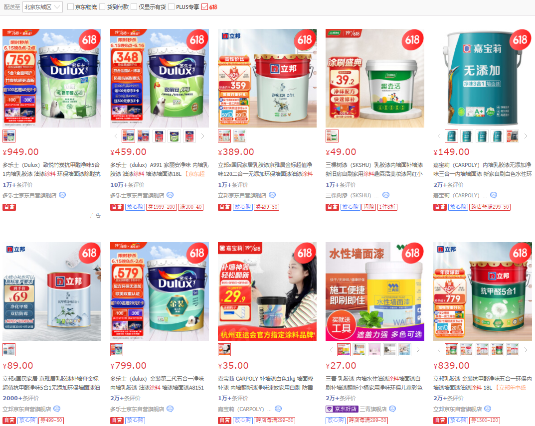 此外,東方雨虹、亞士漆等知名涂料品牌企業也在線上官方旗艦店打出標語,參加平臺滿減活動,部分產品到手價給予了大力度的折扣等。在京東平臺,也可以看到,以“涂料”為關鍵字,參與618活動的企業眾多,滿眼都是打折促銷的火爆紅色,商品品類和數量都超乎你的想象,更有買涂料送家電、滿額送工具、抽獎送涂裝、0元購等多種促銷方式。