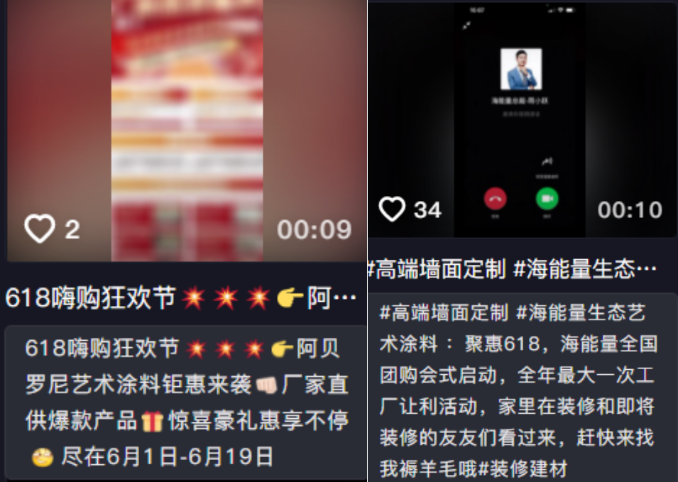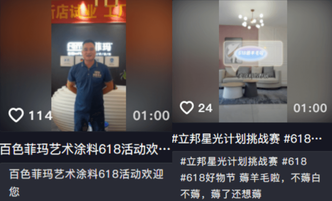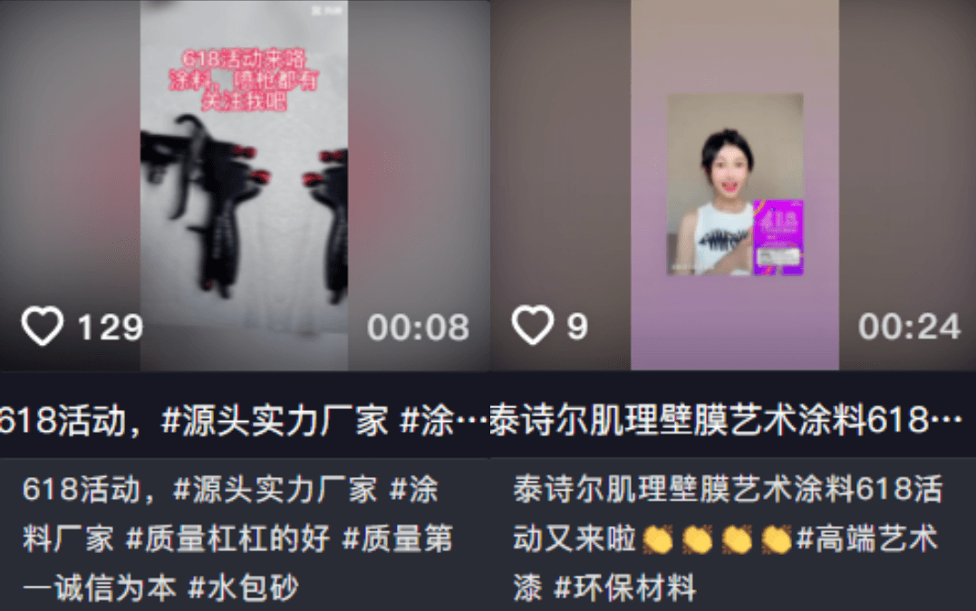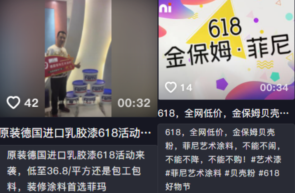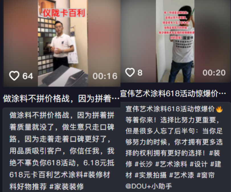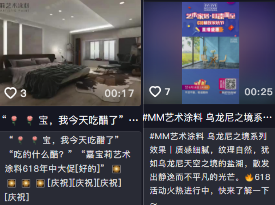 另外在抖音平臺,藝術涂料、乳膠漆等品類的涂料企業也紛紛加入#618 #家裝節等話題,打出驚爆價的旗號進行產品促銷。相比于淘寶、京東等購物平臺,抖音、快手等視頻平臺則更加靈活自由,宣傳成本更低,如果開店還能享受平臺給予的流量扶持和“萬券齊發”獎勵,更是令人心動。