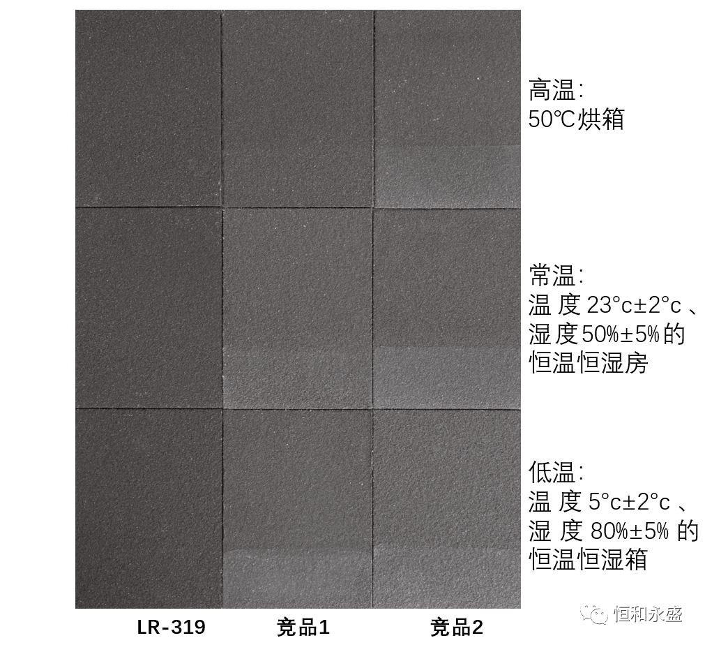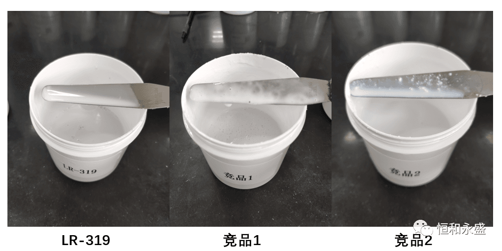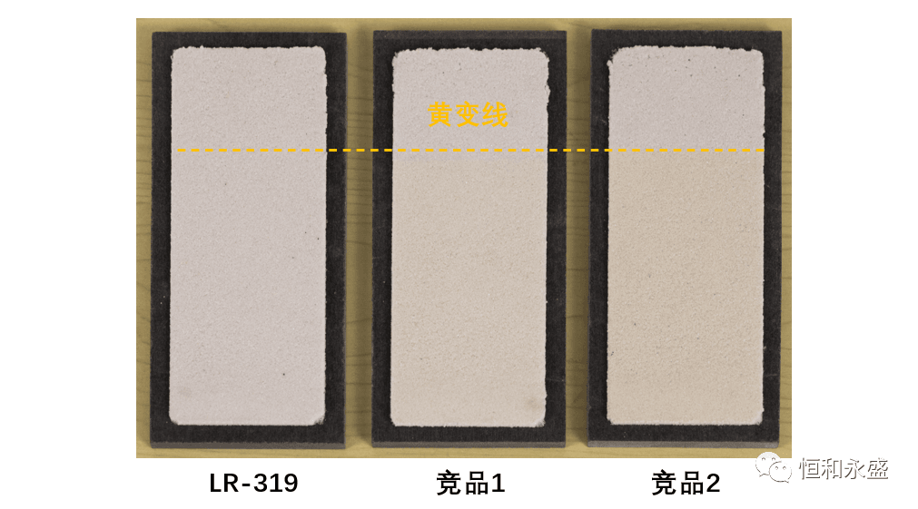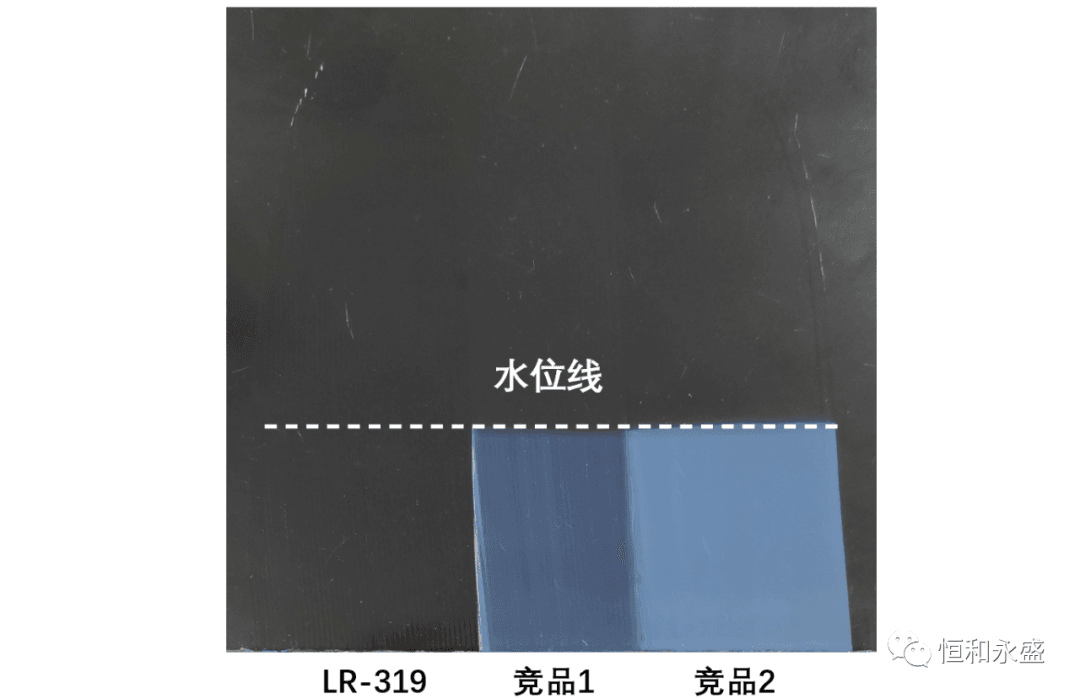 測試小結:競品1與競品2泡水部分均泛白,而LR-319沒有明顯泛白現象,故LR-319的初期耐水性明顯好于競品。