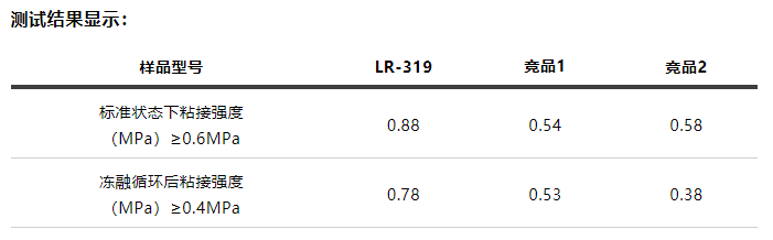 測試小結:由測試結果顯示,LR-319標準狀態下粘接強度≥0.6MPa,凍融循環后粘接強度≥0.4MPa,通過國標JG/T24-2018標準,而競品未能通過國標,故LR-319粘結強度比競品佳。