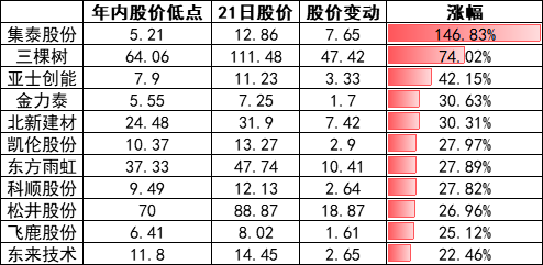 另據(jù)涂料采購網(wǎng)了解,21日,以防水涂料和建材涂料領域為代表的多家上市公司集體飆紅。21日,集泰股份股價較年內(nèi)股價低點上漲7.65元,漲幅146.83%;三棵樹股價較年內(nèi)低點上漲47.42元,漲幅74.02%;亞士創(chuàng)能、金力泰、北新建材等股價較年內(nèi)低點上漲在20%——40%之間。