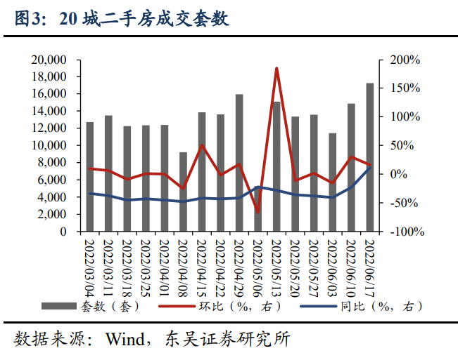 地產(chǎn)板塊股市的紅火是否也反應出了現(xiàn)貨市場的火爆呢?讓我們一起來看一看。房地產(chǎn)市場,上周(2022.6.13-2022.6.19)60城新房成交面積515.9萬平,環(huán)比+36.9%,20城二手房成交面積155.9萬平,環(huán)比+14.8%,同比+3.6%;16城新房累計庫存10209.9萬平,同比+9.6%。16城新房累計庫存10218.9萬平,環(huán)比基本持平,同比+8.5%。