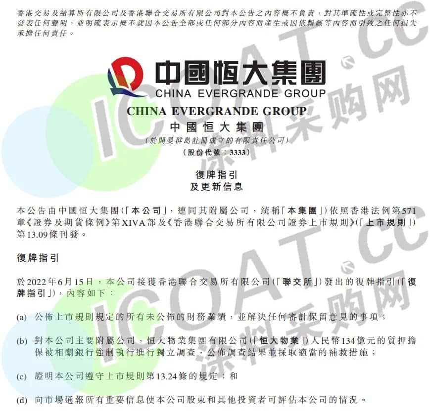 近日,中國恒大、恒大物業、恒大汽車分別發布復牌指引公告。中國恒大表示,公司正在積極推進重組工作,預期將于7月底前公布初步重組方案。同時,恒大物業的質押擔保獨立調查正在積極進行中,現階段尚未能確定預期完成獨立調查的時間。